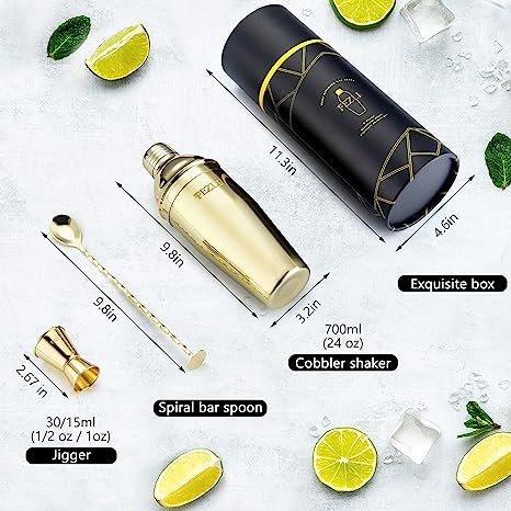 The Golden 5 PCS Cocktail Making Set is the perfect starter kit for any home bartender. It includes a durable stainless-steel cocktail shaker, a 15/30ml double jigger, and a 25cm spiral mixing spoon, all crafted from high-quality, rust-free steel.